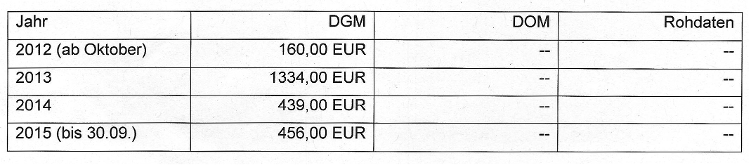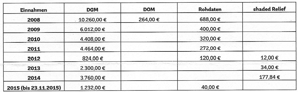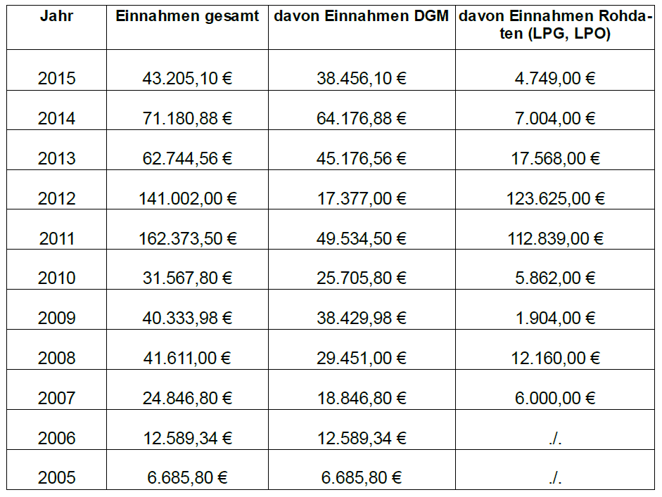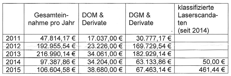 LiDAR acquisitions are expensive and while it would be interesting to also find out how much each state has actually spent on airborne surveys over the past years (another „Frag den Staat“ request anyone?), it is obvious that the reported revenues are just a tiny fraction of those costs. Exact details of the reported revenue per year can be accessed via the links to the information requests above. The cost table of each answer letter is copied below.