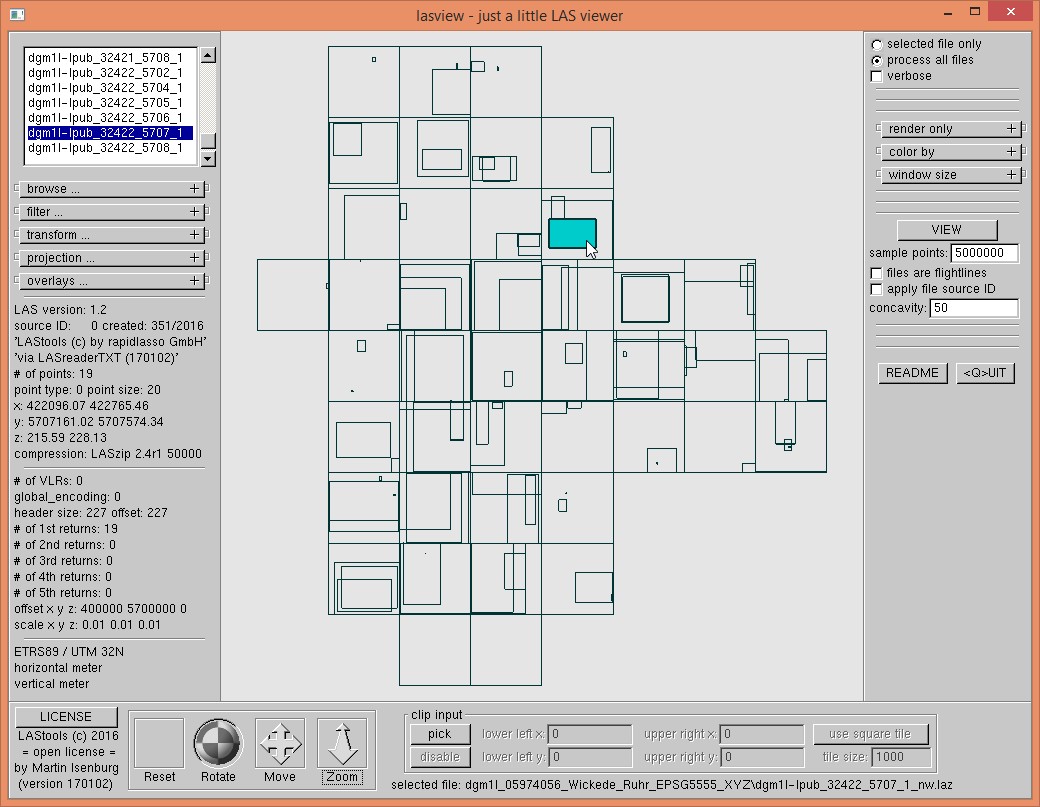 The DGM zip file has a total of 212 *.xyz files that list the x, y, and z coordinate for each point in ASCII format. We first compress them and add the EPSG 25832 code with laszip. The compressed LAZ files are less than half the size of the zipped XYZ files. Each file corresponds to a particular square kilometer. The name of each tile contains the lower left coordinate of this square kilometer but there can be multiple files for each square kilometer: