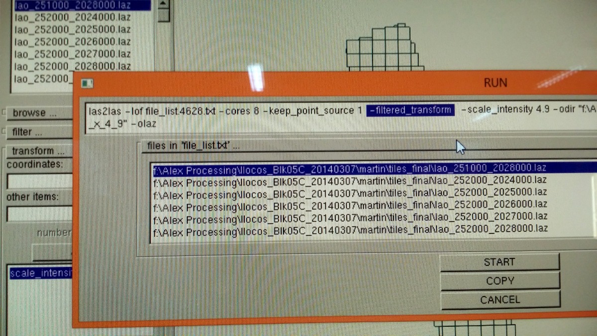 But what if your data is already in tiles? How can you adjust only the intensity of those returns that are from the flightline 1? Assuming that your flightline information is properly stored in the point source ID field of every point this is easily done with the new ‚-filtered_transform‘ in LAStools using las2las on as many cores as you have as follows: