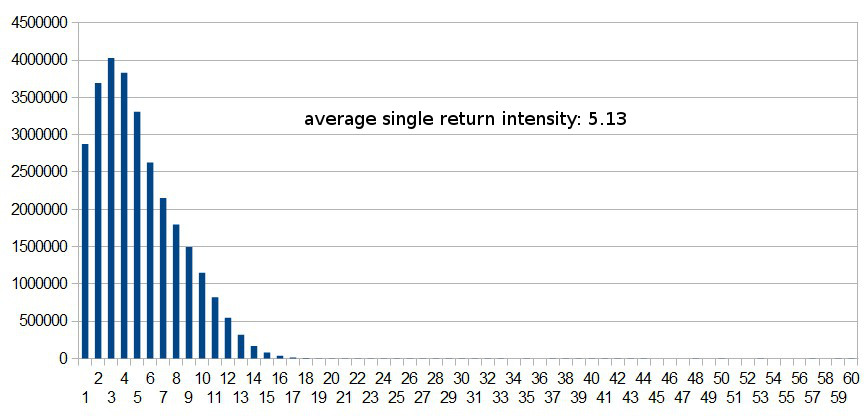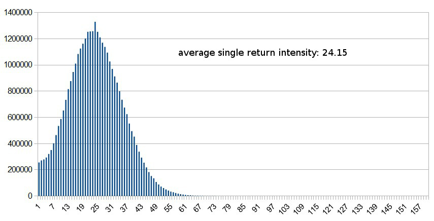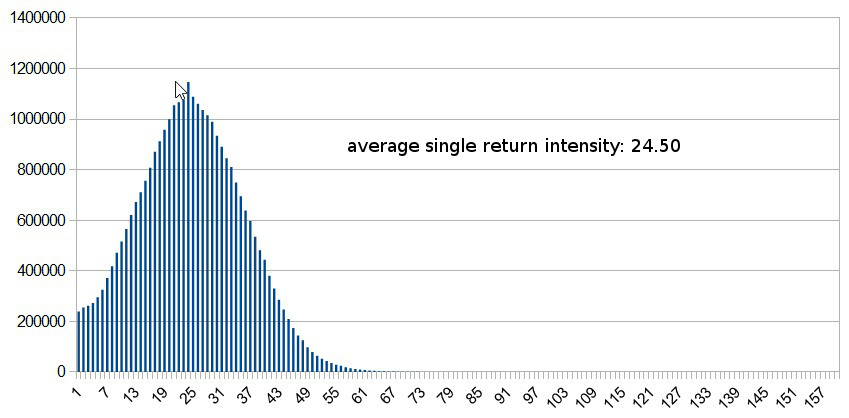 The resulting histograms for the dark ’strip1.laz‘ is quite different from that of the much brighter ’strip2.laz‘ and ’strip3.laz‘. The average single return intensity for the dark ’strip1.laz‘ is a meager 5.13 whereas the brighter ’strip2.laz‘ and ’strip3.laz‘ have similar averages of 24.15 and 24.50 respectively.