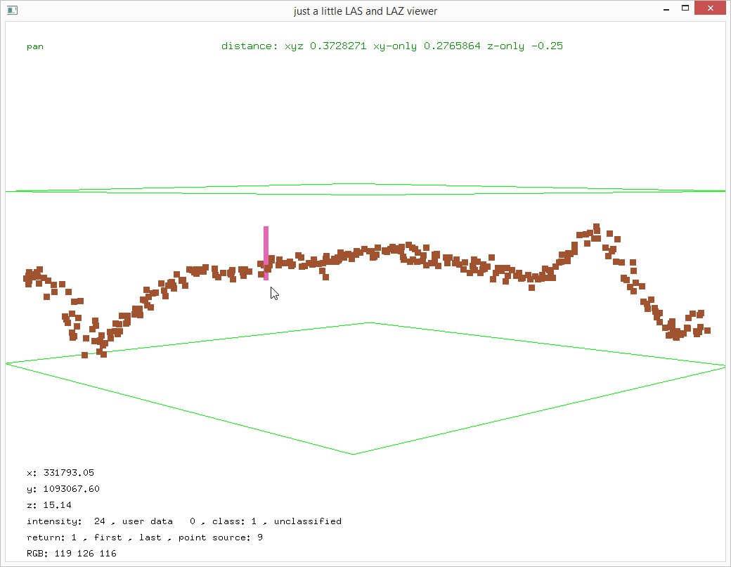 This produces 49 buffered tiles that will now be processed similarly to the workflow outlined for another lower-priced system that generates similarly „fluffy“ point clouds on hard surfaces, the Velodyne HLD-32E, described here and here. What do we mean with „fluffy“? We cut out a 1 meter slice across the road with the new ‚-keep_profile‘ filter and las2las and inspect it with lasview.