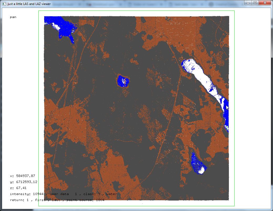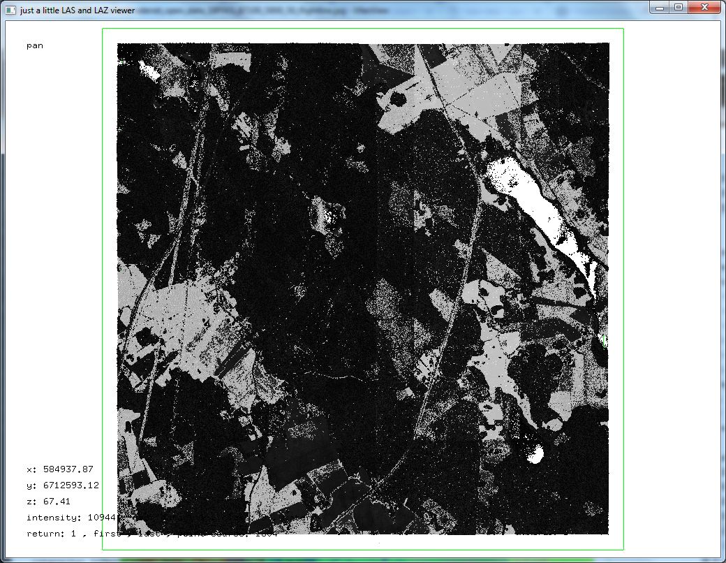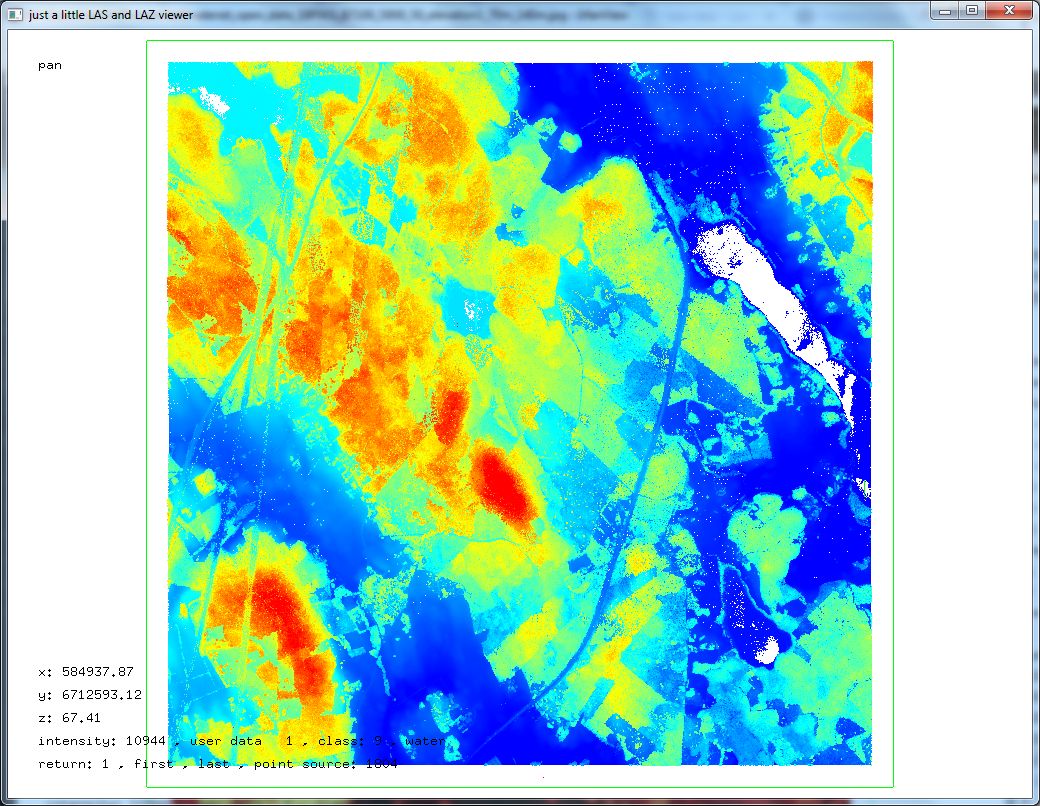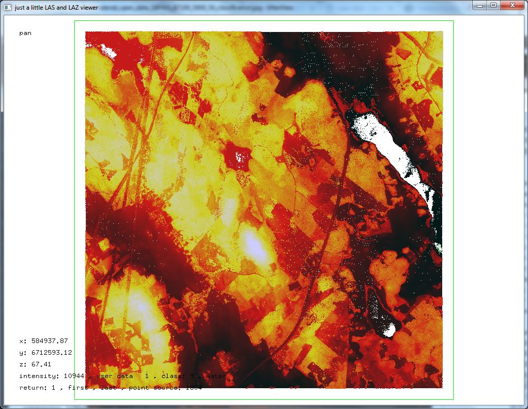 Below a look with lasview at a 5 km by 5 km area that composed of the four tiles ‚18P001_67100_5800_25.laz‚, ‚18P001_67100_5825_25.laz‚, ‚18P001_67125_5800_25.laz‚ and ‚18P001_67125_5825_25.laz‚ with several of the different color modes available.