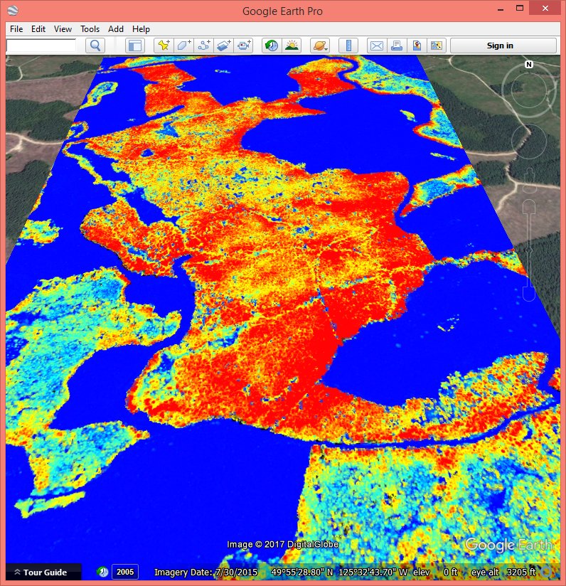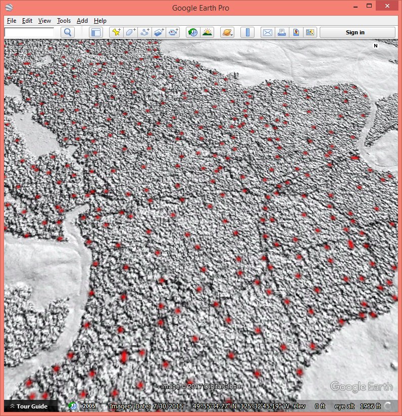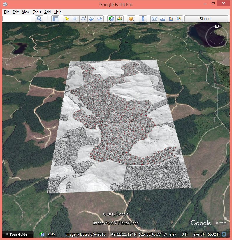 Here you can download the resulting color-coded CHM and the resulting hill-shaded DTM as Google Earth KMZ overlays. Clearly the resulting CHM is only meaningful in the target forest where we used the manually collected ground points to create a reasonable DTM. In the other forested areas the ground is only correct near the forest edges and gets worse with increasing distance from open areas. The resulting DTM exhibits some interesting looking bumps in the middle of areas with manually collected ground point. Those are a result of using the dense-matching points as ground whenever their elevation is lower than that of the manually collected points (which is decided in the lasthin step). Whether those bumps represent true elevations of are artifacts of low erroneous elevation from dense-matching remains to be investigated.