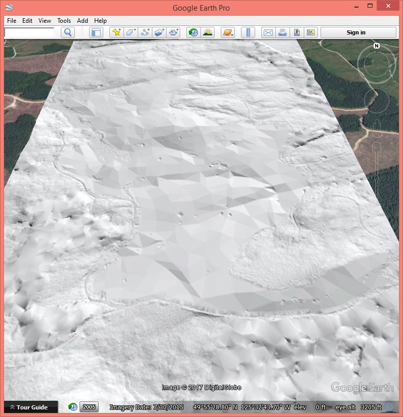 We leave the usual inspection of the content with lasinfo and lasview that we always recommend on newly obtained data as an exercise to the reader. Using las2dem and lasgrid we created the Google Earth overlays shown above to visualize the extent of the dense matched point cloud and the distribution of the manually collected ground points: