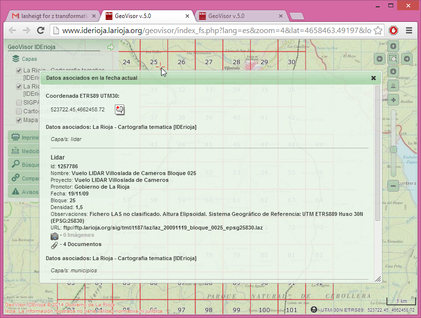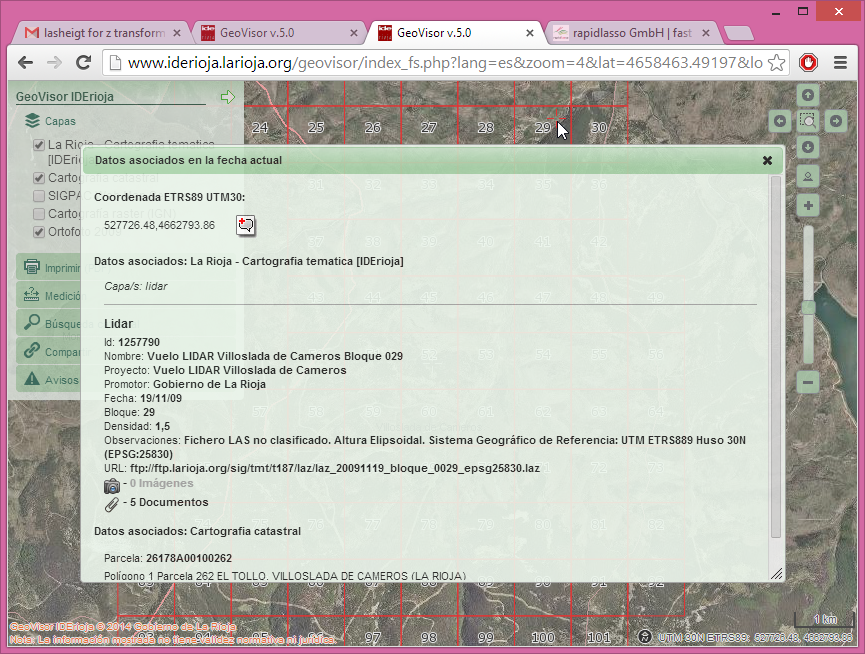 The Geographic Information Section of the Government of La Rioja in Spain has integrated information about their „open LiDAR“ data with a WMS server allowing their users to easily find and download it. The WMS layer contains attributes for each tile that include download links to compressed LiDAR files in LAZ format or additional technical documents. Users can access this WMS service through standard GIS clients that implement OGC protocols (QGIS, gvSIG, ArcGIS …).