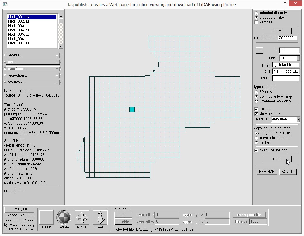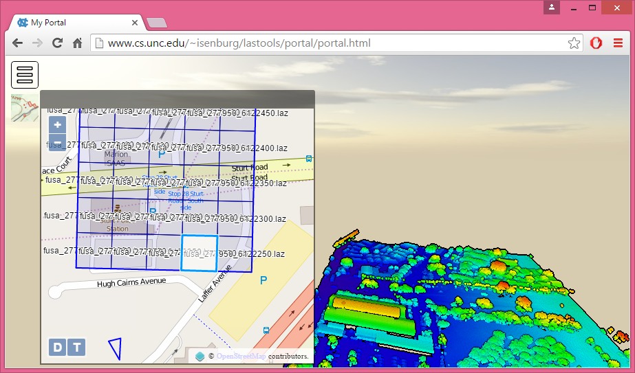 The new ‚laspublish‚ is now an integral part of the LAStools software and is bundled together with all necessary components of the Potree software. It provides an instant and cost-effective solution for generating a set of Web pages that realize a self-contained LiDAR portal offering interactive online visualization and exploration as well as easy and intuitive distribution of large LiDAR data sets via the optional download map.