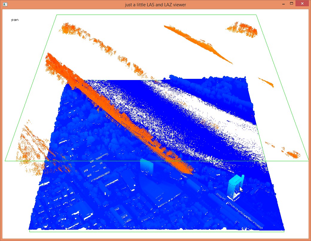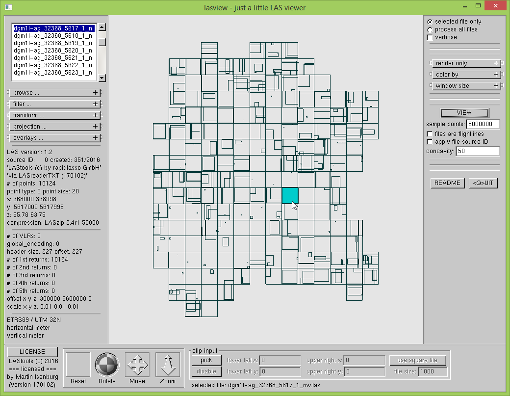 One advantage of having the LiDAR in an industry standard such as the LAS format (or its lossless compressed twin, the LAZ format) is that the header of the file stores the number of points per file, the bounding box, as well as the projection information that we have added. This allows us to very quickly load an overview for example, into lasview.