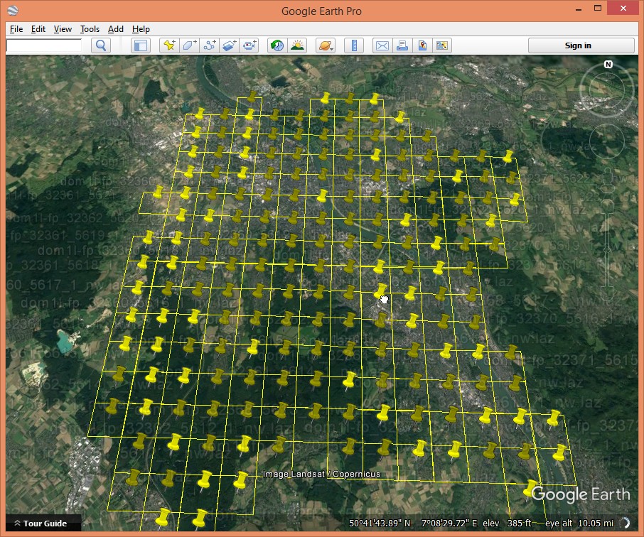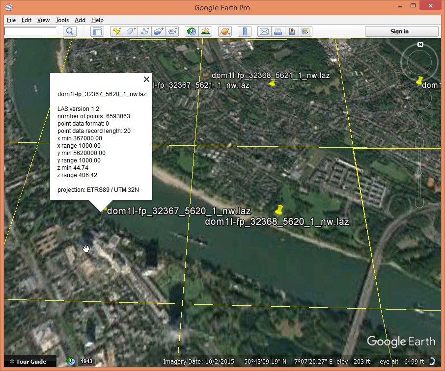 Now we want to find a particular site in Bonn such as the World Conference Center Bonn where FOSS4G 2016 was held. Which tile is it in? We need some geospatial context to find it, for example, by creating an overview in form of KML files that we can load into Google Earth. We use the files from the DOM folder with “fp” in the name as points on buildings are mostly „first returns“. See what our previous blog post writes about the different file names or look at the second part of this series. We can create the KML files with lasboundary either via the GUI or in the command line.