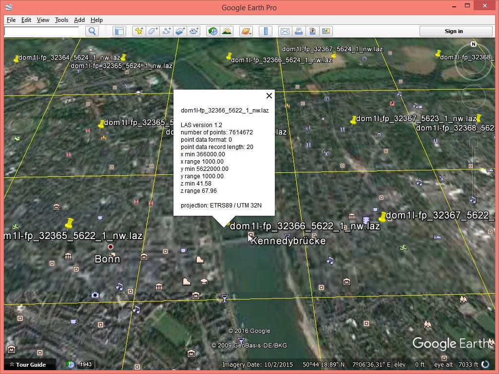 In the first part of this series we downloaded the pair of DGM and DOM files for the City of Bonn. The DGM file and the DOM file are zipped archives that contain the points in 1km by 1km tiles stored as x, y, z coordinates with centimeter resolution. We had already converted these textual *.xyz files into binary *.laz files. We did this with the open source LASzip compressor that is distributed with LAStools as described in that blog post. We continue now with the assumption that you have converted all of the *.xyz files to *.laz files as described here.
