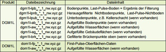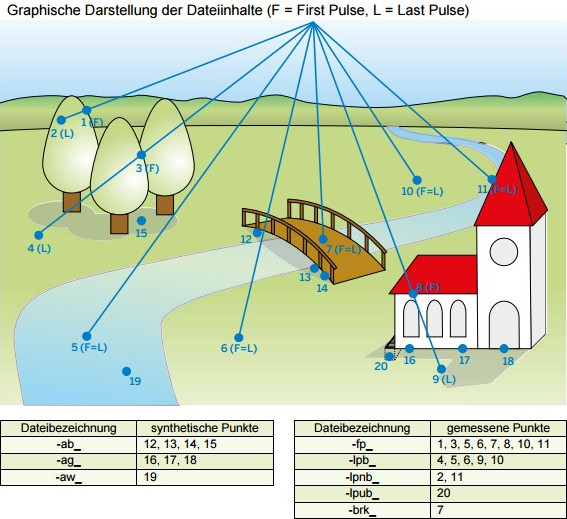 There are multiple tiles for each square kilometer as the LiDAR has been split into different files based on classification and return type. Furthermore there are also synthetic points that were created by the land survey department to replace LiDAR under bridges and along buildings for generating higher quality rasters. We want to combine all points of a square kilometer into a single LAZ tile as it is usually expected. Simply merging the multiple files per tile is not an option as this would result in loosing point classifications and return type information as well as in duplicating all single returns that are stored in more than one file. The folks at OpenNRW offer this helpful graphic to know what the acronyms above mean: