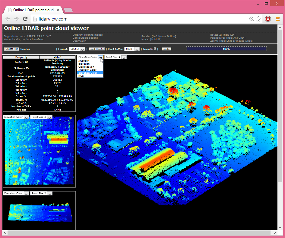 Nifty! Am online Web viewer for LiDAR data in LAS or ASCII format that can load files from your local drive. Very handy in case you need to inspect or show off a LAS file but do not have any LiDAR viewer installed on your computer – especially in case it should run cross-platform in any browser (does it?). But no LAZ support yet … (-;