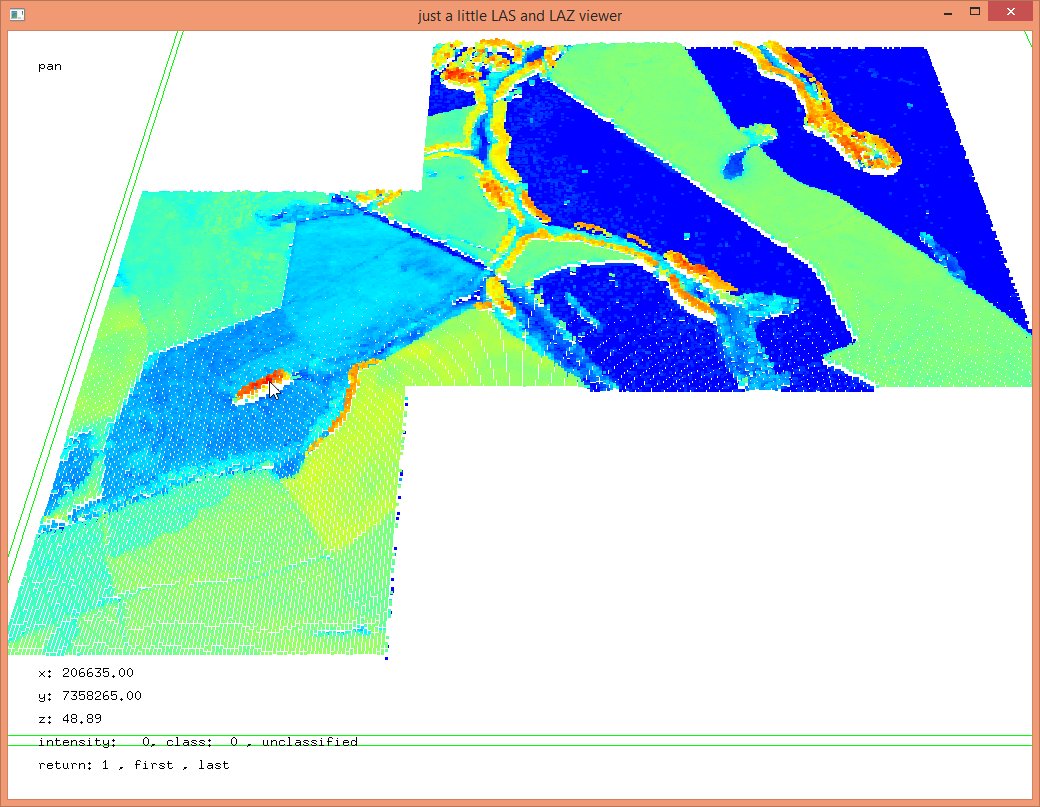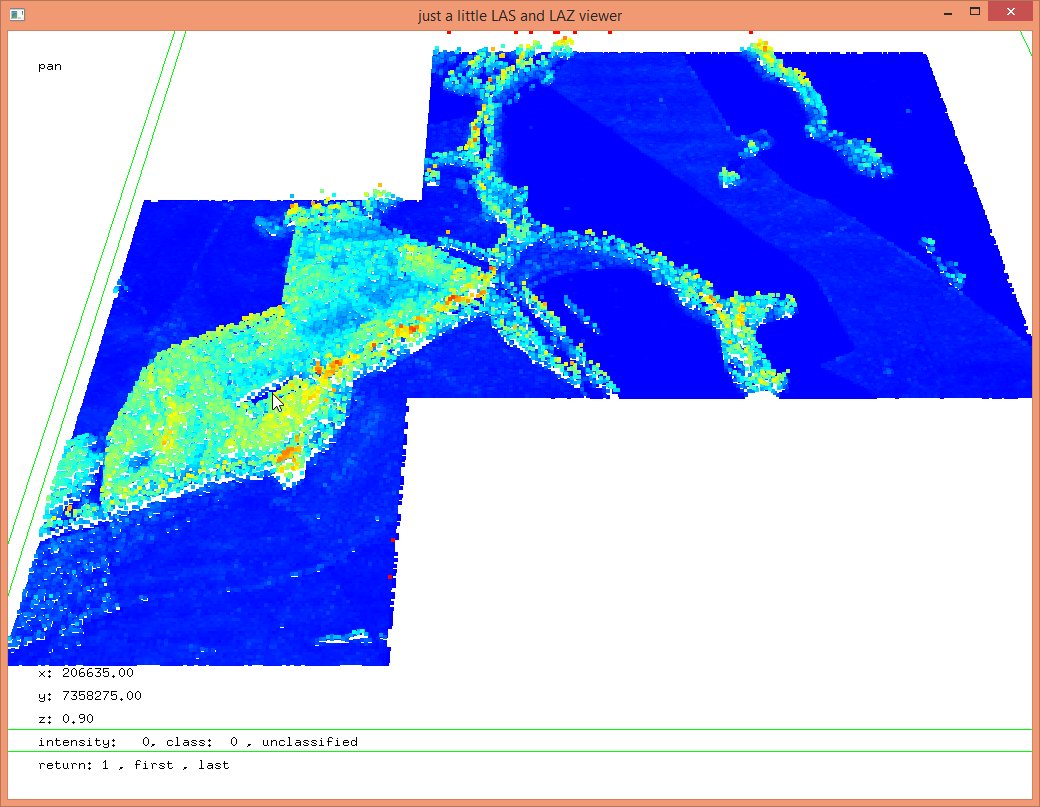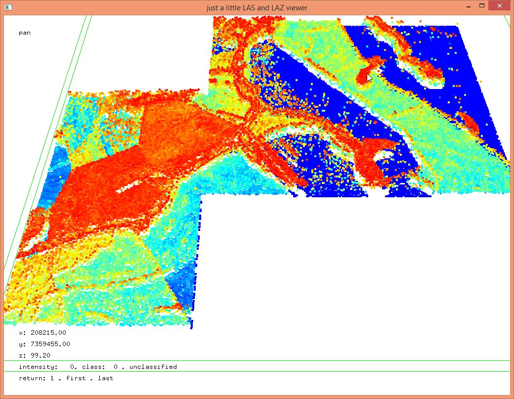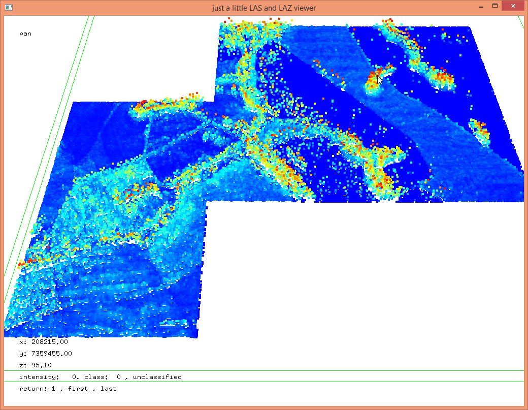 We run lasgrid to visualize the pulse density per 2 by 2 meter cell and per 5 by 5 meter cell. The produced images (see below) color code the number of last return per square meter. The impact of the tall Eucalyptus trees on the density per cell computation is evident for the smaller 2 meter cell size in form of a noisy blue/red diagonal in the top right as well as a noisy blue/red area in the bottom left. Both of those turn to a more consistent yellow for the density per cell computation with larger 5 meter cells. Immediately evident is the higher density (red) for those parts or the two tiles in the upper left that are covered by the additional diagonal flightline. The blueish area left to the center of the image suggests a consistently lower pulse density whose cause remains to be investigated: Lower reflectivity? Missing last returns? Cloud cover?