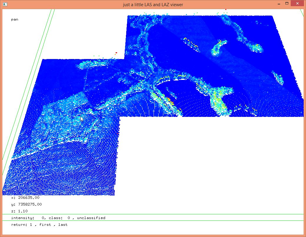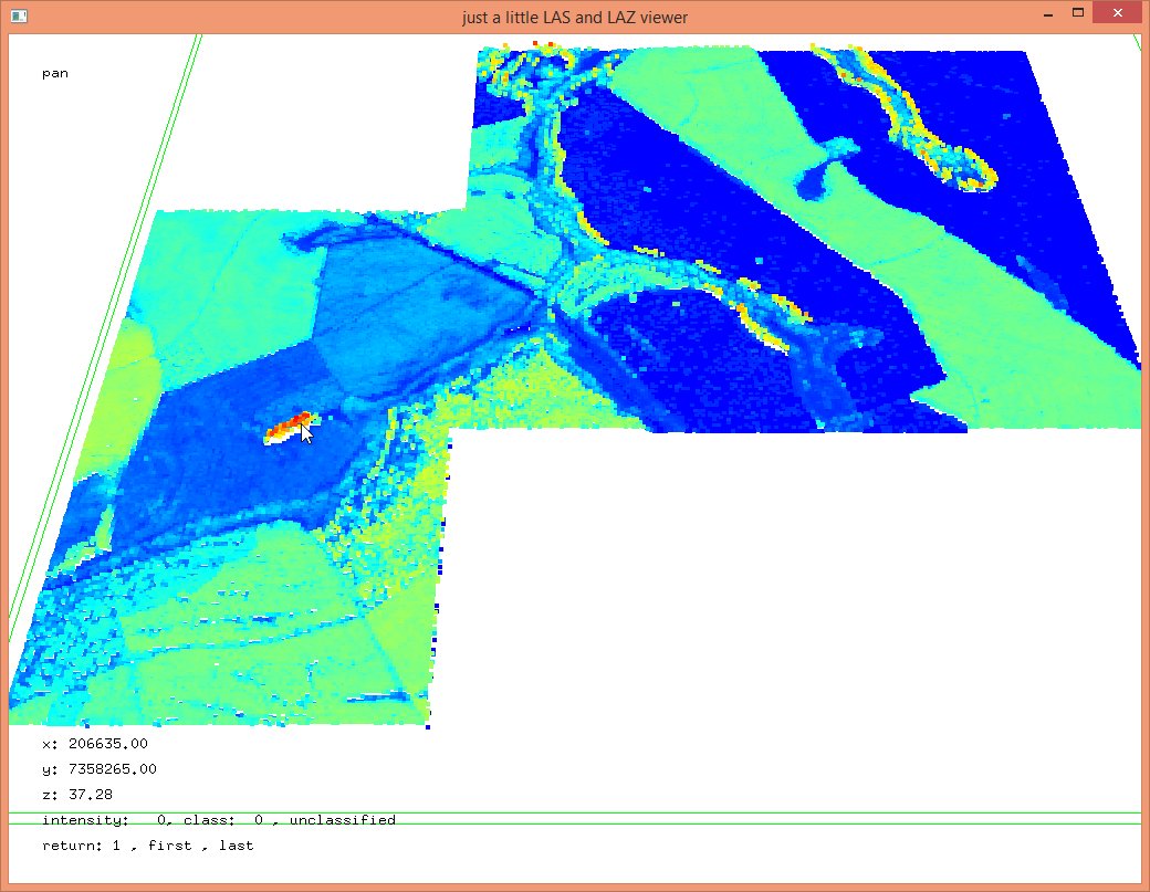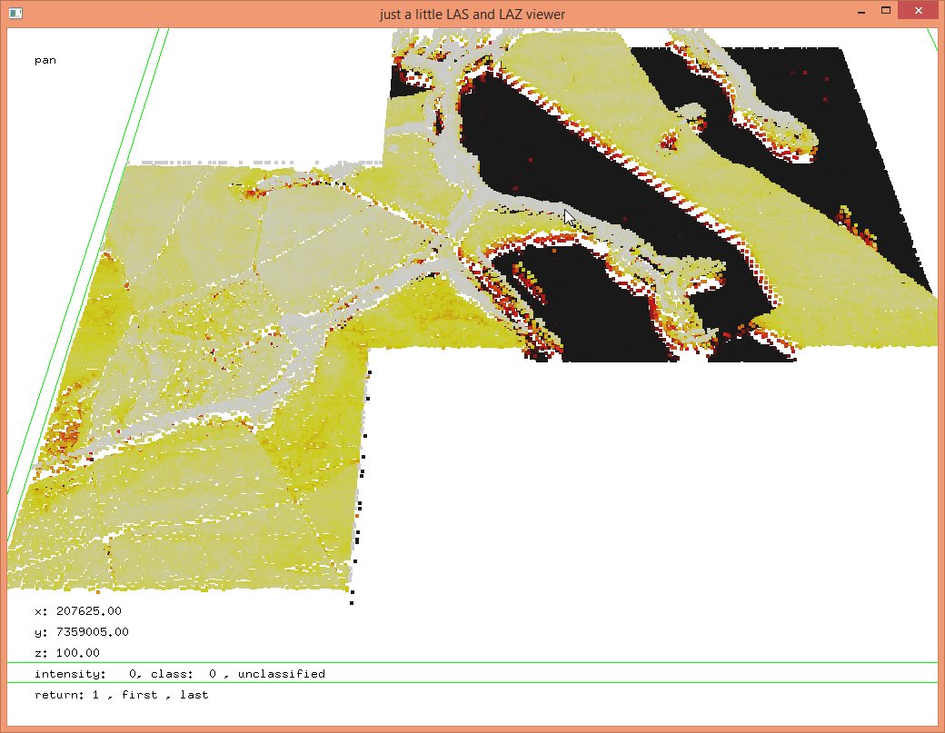 The lasinfo report also tells us that the xyz coordinates are stored with millimeter resolution which is a bit of an overkill. For higher and faster LASzip compression we will later lower this to a more appropriate centimeter resolution. It further tells us that the returns are stored using point type 0 and that is a bit unfortunate. This (older) point type does not have a GPS time stamp so that some quality checks (e.g. „completeness of returns“ with lasreturn) and operations (e.g. „resorting of returns into acquisition order“ with lassort) will not be possible. Fortunately the min-max range of the ‚point source ID‘ suggests that this point attribute is correctly populated with flightline numbers so that we can do a check for overlap and alignment of the different flightlines that contribute to the LiDAR in each tile.