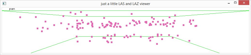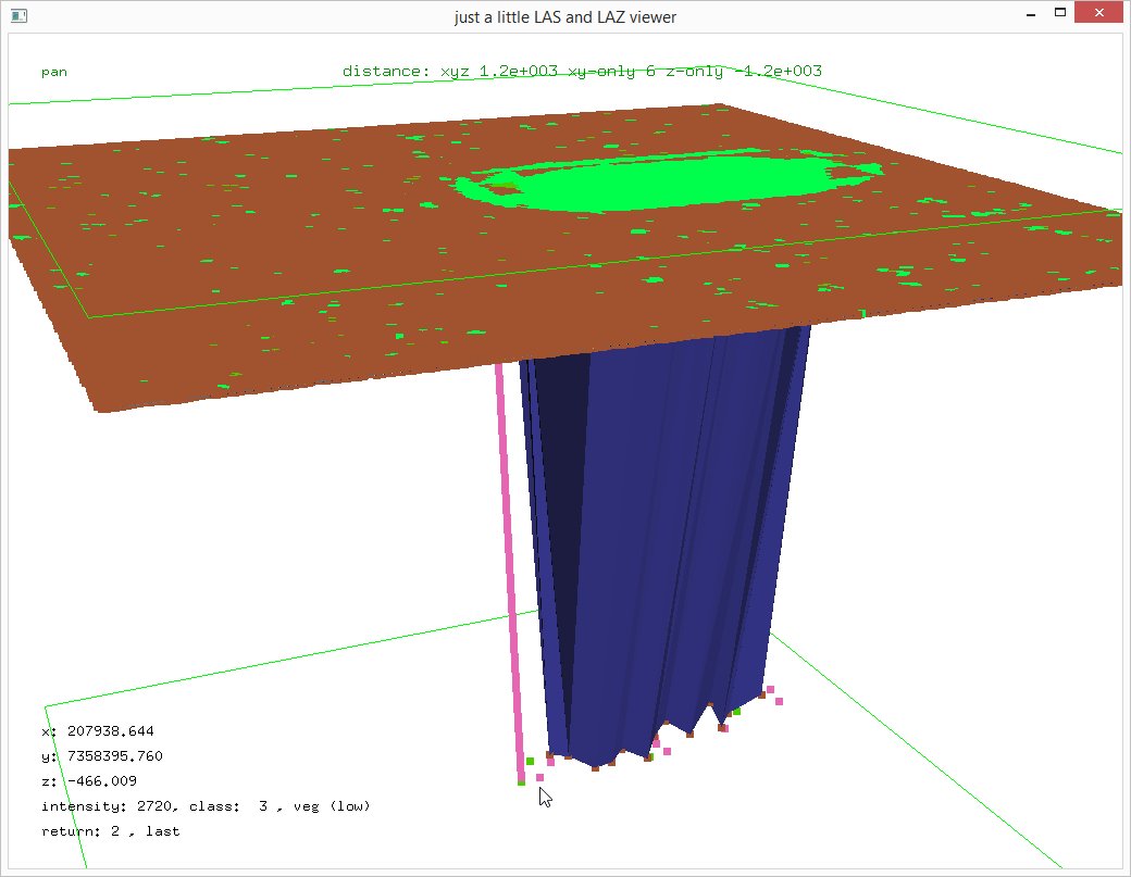 With lasnoise we mark the many isolated points that are high above or below the terrain as class 7 (aka noise). Using two tiles we played around with the ’step‘ parameters until we find good parameter settings. See the README of lasnoise for the exact meaning and the choice of parameters for noise classification. We look at one of the resulting tiles with lasview.