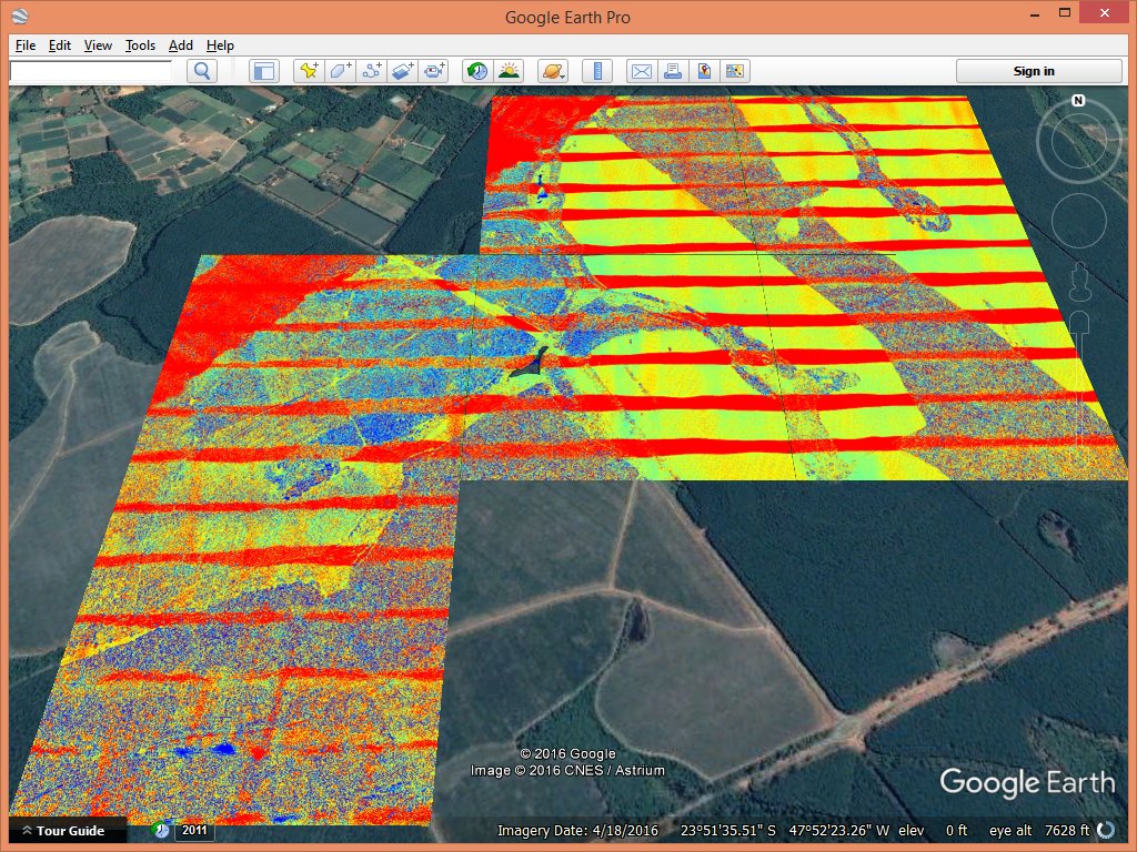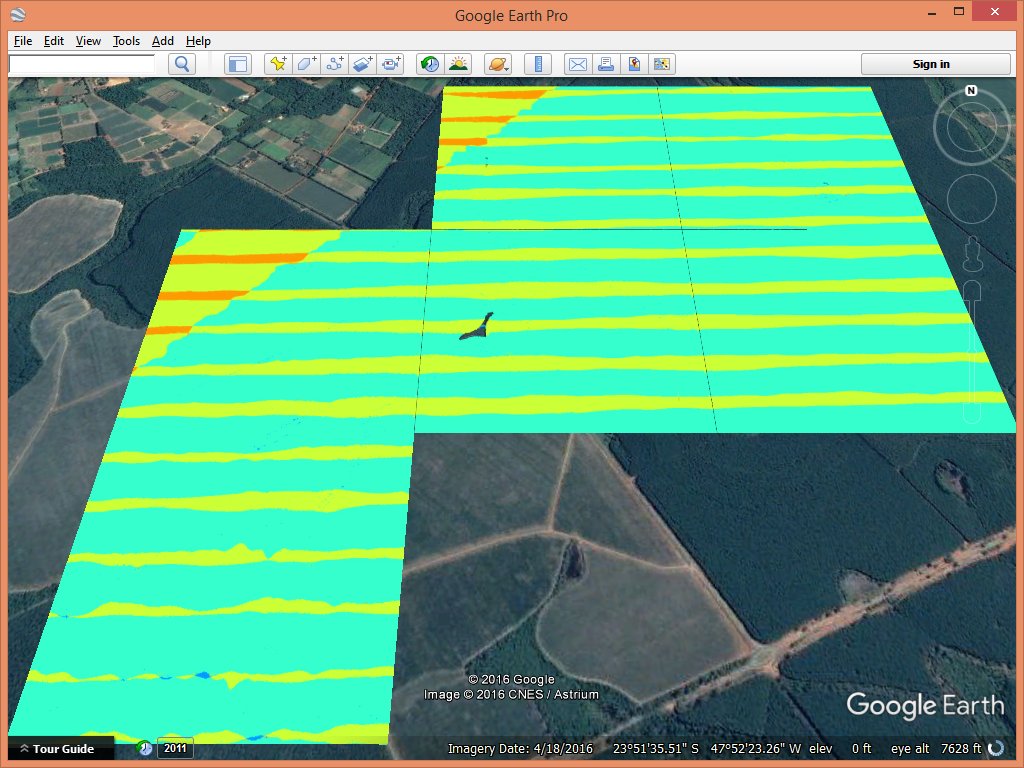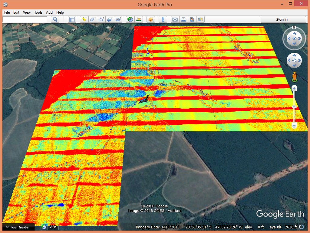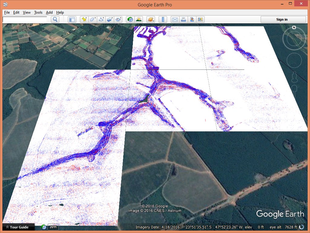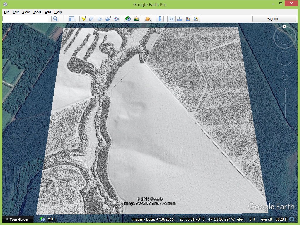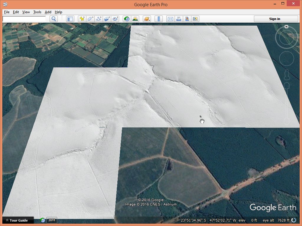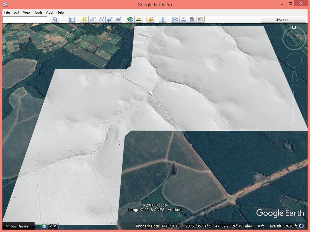 The lasinfo report tells us that there is no projection information. However, we remember that this Brazilian data was in the common SIRGAS 2000 projection and try for a few likely UTM zones whether the hillshaded DSM produced by las2dem falls onto the right spot in Google Earth.