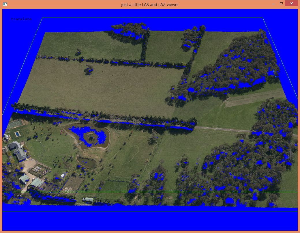 The ‚macmahanfarm.laz‘ file has 140,616,508 RGB-colored points and was provided by Pix4D as a LAZ file of 1.2 GB that decompresses to 4.5 GB of LAS. The unusually low LASzip compression ratio of „only“ 1:4 comes from the incoherent order of the points in the file and their excessive coordinate resolution.