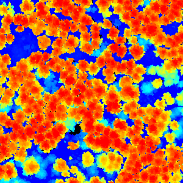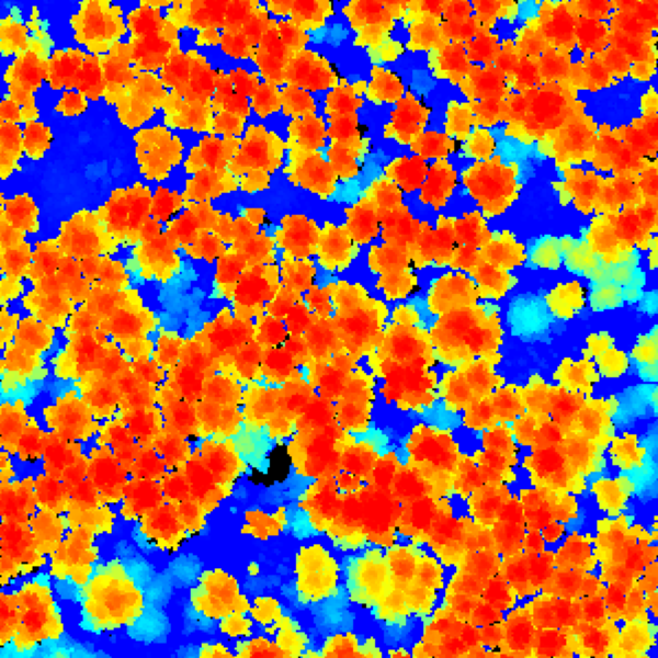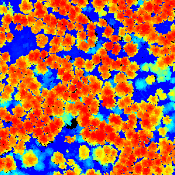 The resulting CHM (shown again at a 200 % zoom) is much improved but there are still empty pixels and „pits“. We could simply widen the circles further with ‚-subcircle 0.15‘, ‚-subcircle 0.2‘, or ‚-subcircle 0.25‘. As you can see below this produces increasingly smooth CHMs with widening tree crowns. But this „splats“ the LiDAR returns into circles that are growing larger and larger than the laser beam diameter and thus have less and less in common with reality.