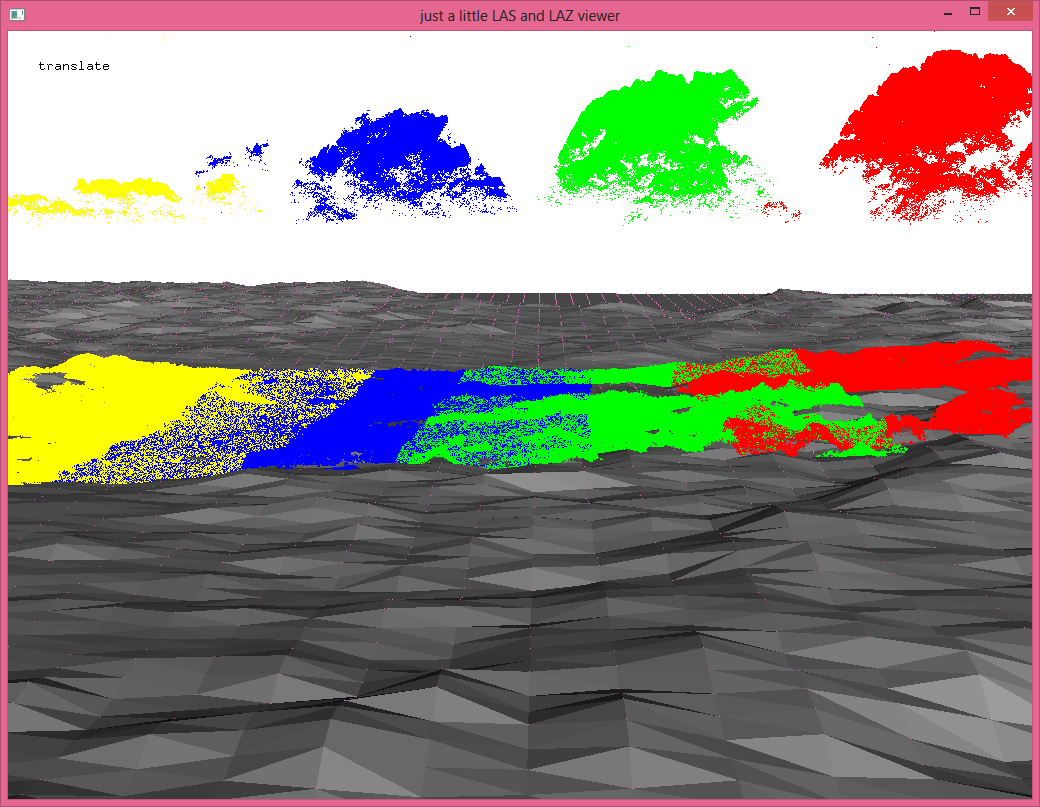 The ‚masbate.laz‘ file is a little bit bigger than before because the tiny ‚masbate.lax‘ file (that can also be stored separately) was appended to the end of ‚masbate.laz‘ via the ‚-append‘ option. Spatial indexing is realized with an underlying quadtree that can be visualized with lasview by pressing ‚Q‘ (or with the pop-up menu) and the points corresponding to each quadtree cell can be turned blue by hovering above a cell and pressing ‚q‘.