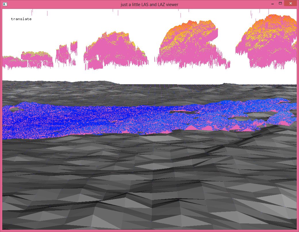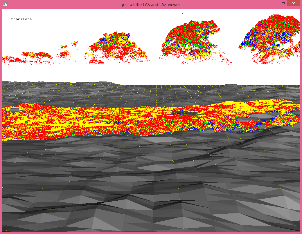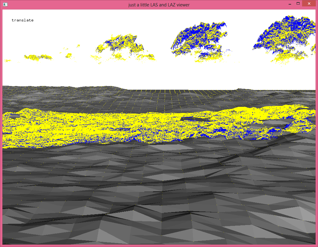 By triangulating only the Aster DTM points we can visually confirm that the LiDAR points on the terrain are also close to the Aster DTM whereas the cloud returns are far up with a clear seperation between. The pink „drop lines“ of length 50 meters that are dangling off each point give us a sense of scale (enabled via the pop-up menu that appears with a right click). Note how many last returns get stuck in the clouds. Those would likely cause troubles in subsequent ground classification with lasground.
