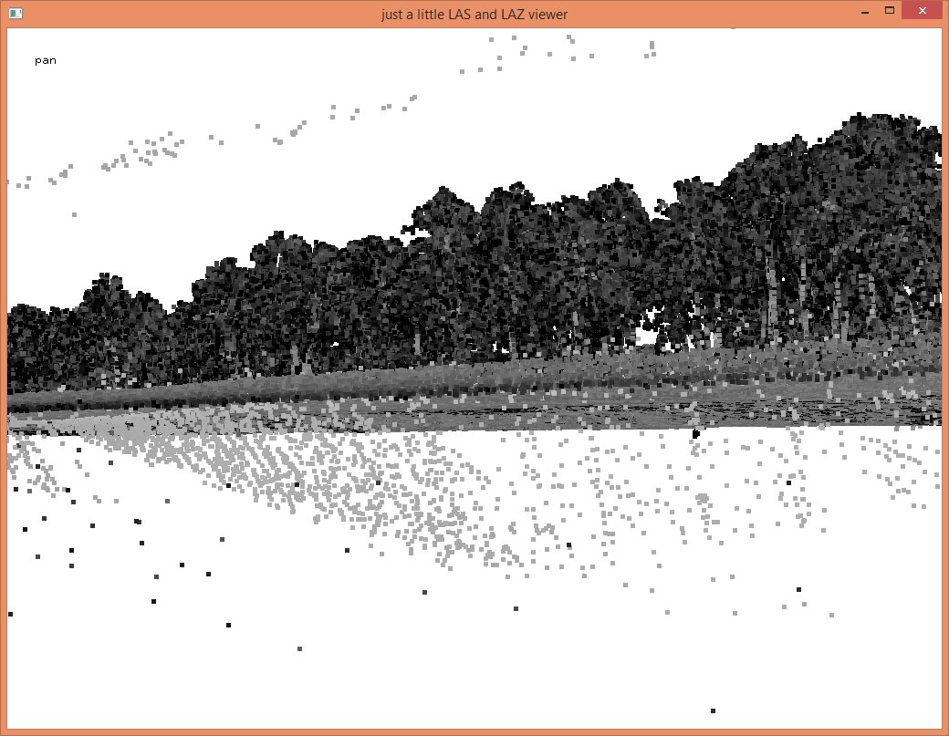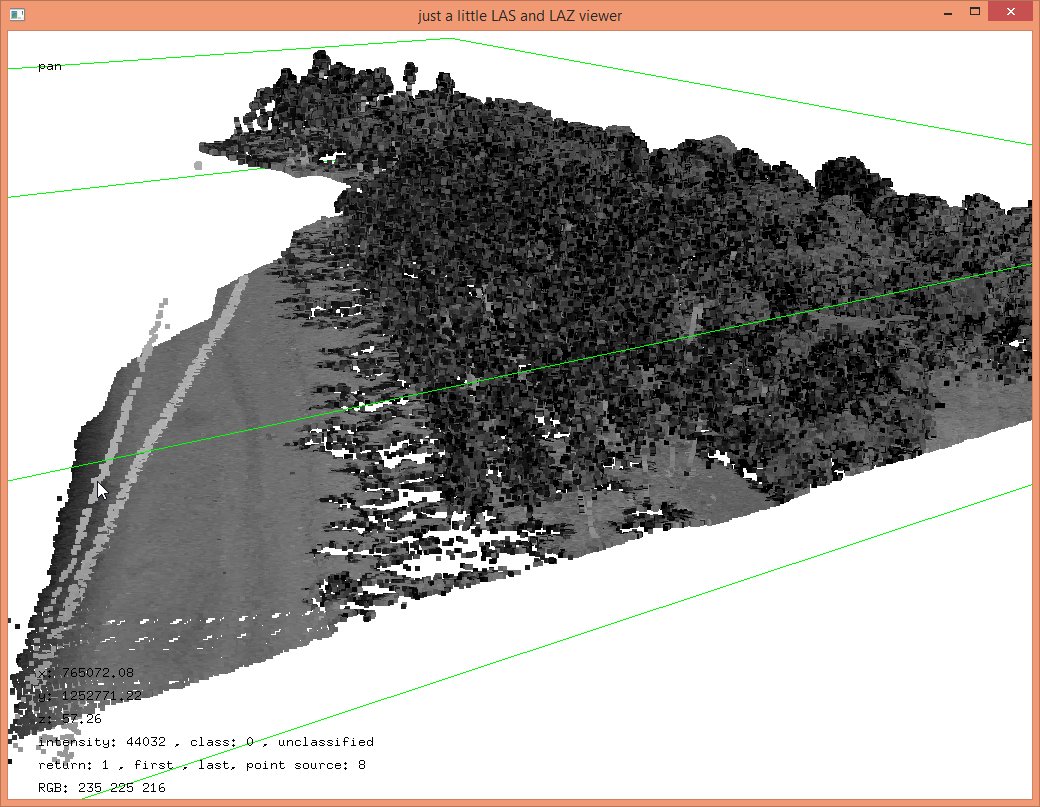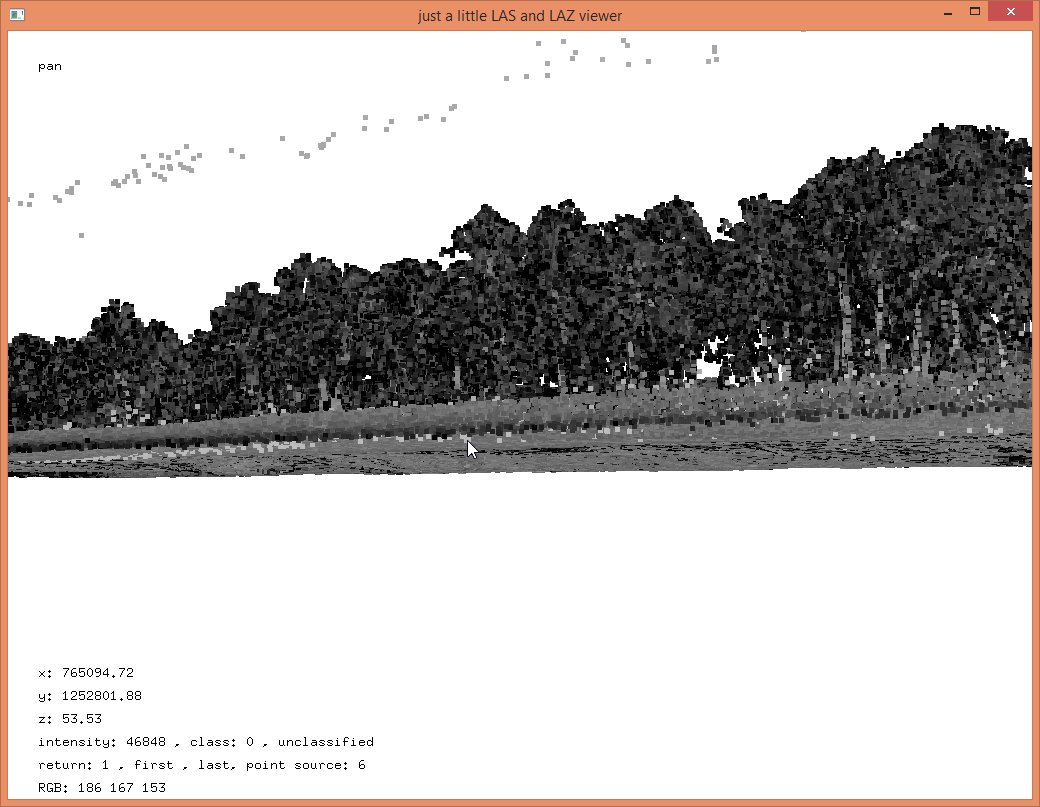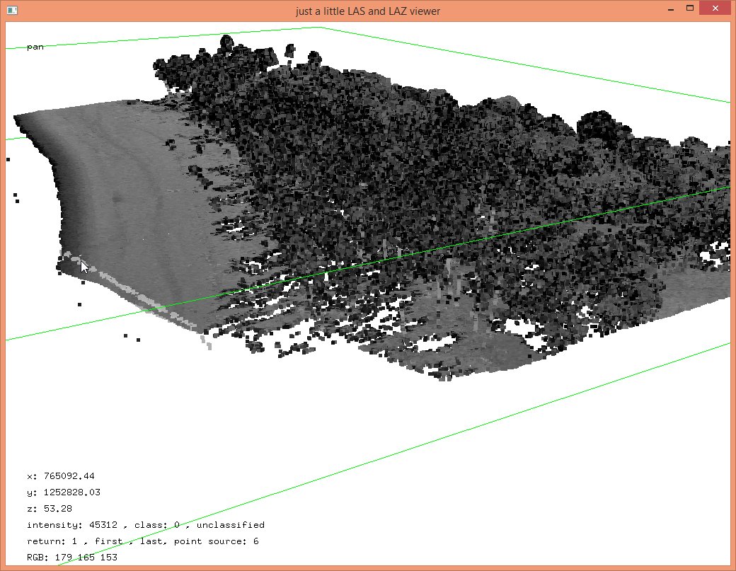 In these steps we implicitly reduced the resolution that each coordinate was stored with from quarter-millimeters (i.e. scale factors of 0.00025) to the default of centimeters (i.e. scale factors of 0.01) which should be sufficient for subsequent vegetation analysis. The LAZ files also compress better when coordinates a lower resolution so that the ‚lalutaya_utm.laz‘ file is over 200 MB smaller than the original ‚lalutaya.laz‘ file. The quantization error this introduces is probably still below the overall scanning error of this helicopter survey.