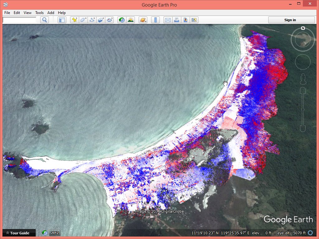 The resulting visualizations show (a) that our datum transform to the WGS84 ellipsoid worked because the imagery aligns nicely with Google Earth and (b) that there are several issues in the data that require further scrutiny.