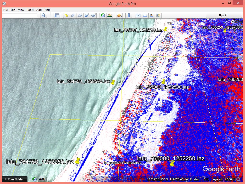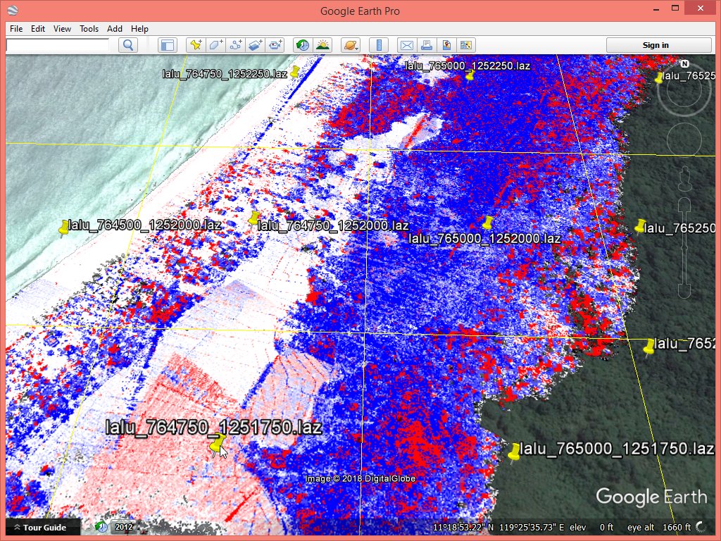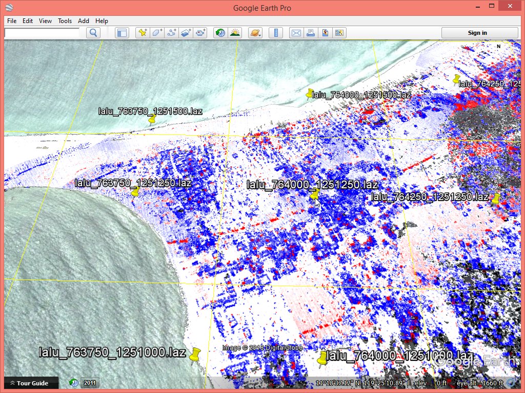 Next comes the standard check of flightline overlap and alignment check with lasoverlap. Once more it become clear why it is so important to have flightline information. Without we may have missed what we are about to notice. We create false color images load into Google Earth to visually assess the situation. We map all absolute differences between flightlines below 5 cm to white and all absolute differences above 30 cm to saturated red (positive) or blue (negative) with a gradual shading from white to red or blue for any differences in between. We also create an overview KML file that lets us quickly see in which tile we can find the points for a particular area of interest with lasboundary.