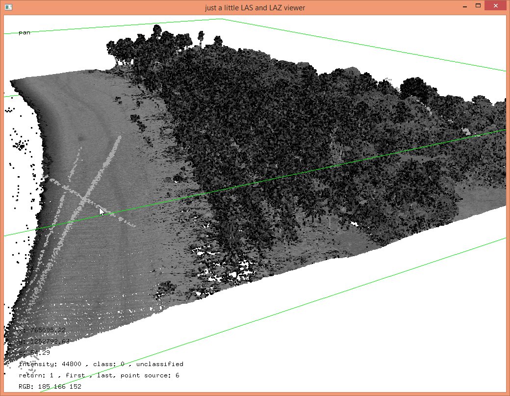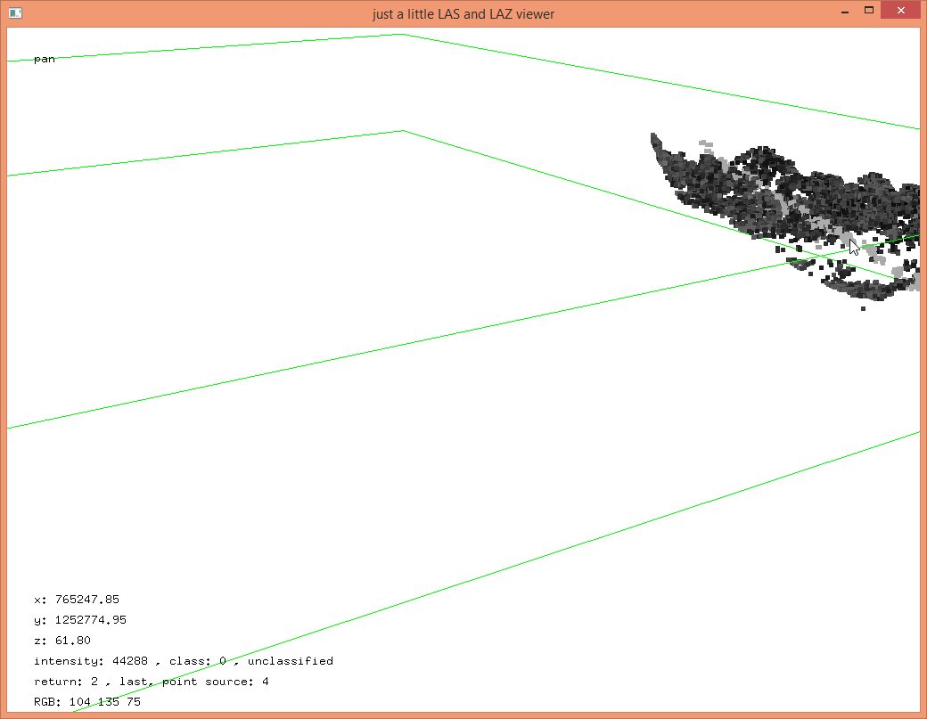 In these steps we implicitly reduced the resolution that each coordinate was stored with from quarter-millimeters (i.e. scale factors of 0.00025) to the default of centimeters (i.e. scale factors of 0.01) which should be sufficient for subsequent vegetation analysis. The LAZ files also compress better when coordinates a lower resolution so that the ‚lalutaya_utm.laz‘ file is over 200 MB smaller than the original ‚lalutaya.laz‘ file. The quantization error this introduces is probably still below the overall scanning error of this helicopter survey.