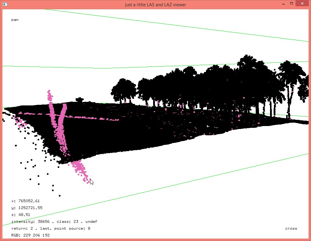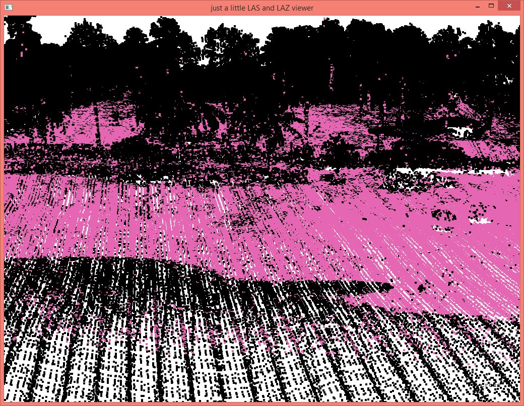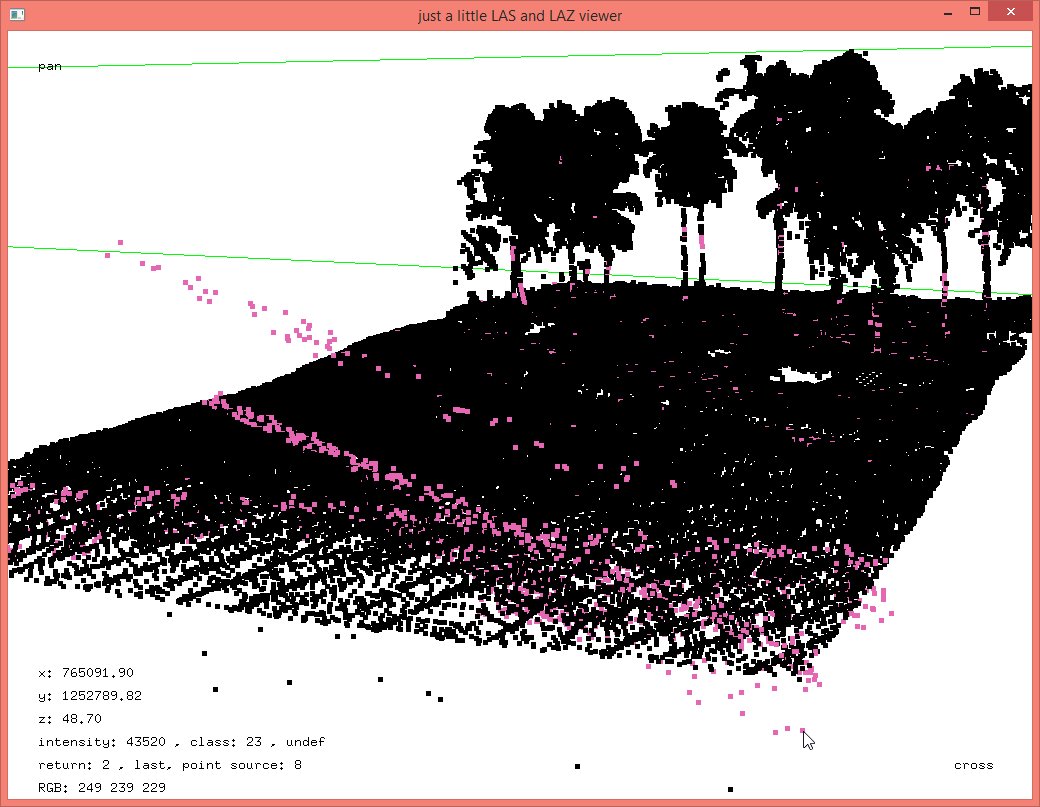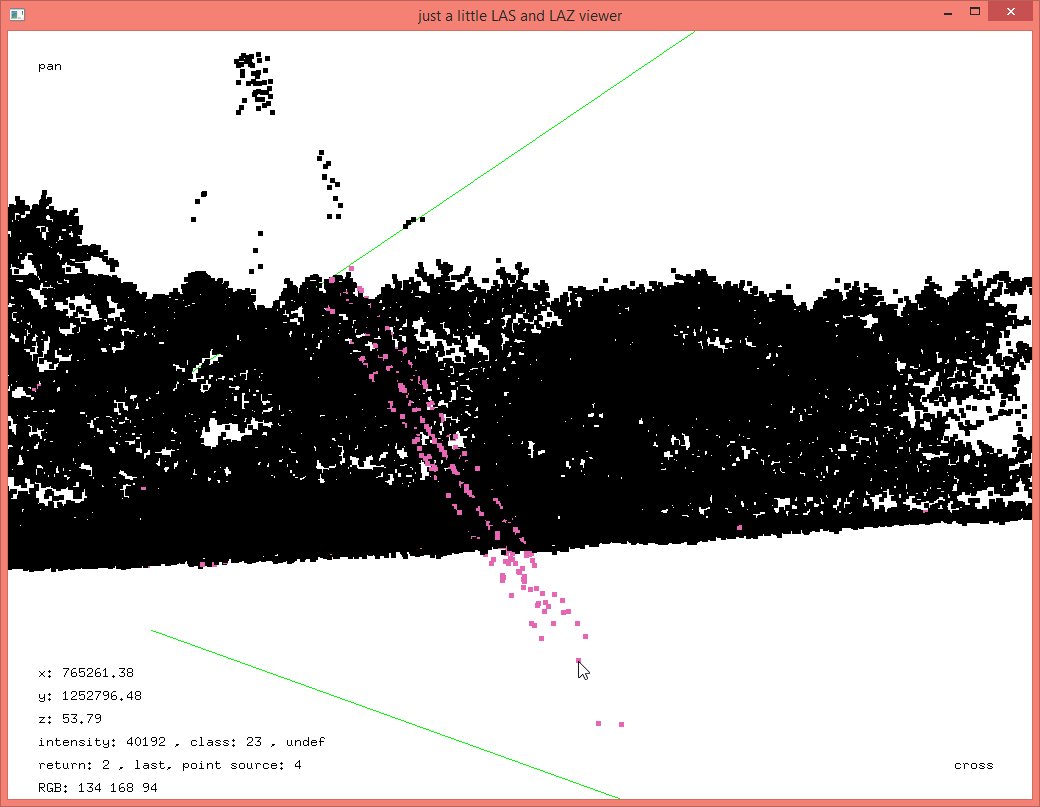 The details on how this batch script works – a pretty standard tile-based multi-core processing workflow – are given as comments in this batch script. Now we have a set of individual ground points computed separately for each flightline and some will include erroneous points below the ground that the lasground algorithm by its very nature is likely to latch on to as you can see here: