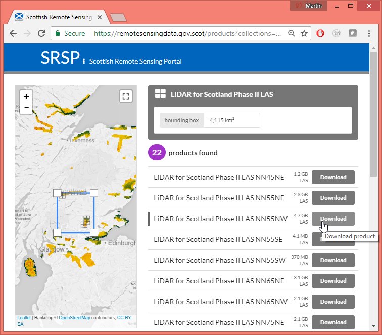 We went to the nice online portal of Scotland to download three files from the Phase II LiDAR for Scotland that are provided as uncompressed LAS files, namely LAS_NN45NE.las, LAS_NN55NE.las, and LAS_NN55NW.las, whose sizes are listed as 1.2 GB, 2.8 GB, and 4.7 GB in the screenshot above. Needless to say that it took quite some time and several restarts (using wget with option ‚-c‘) to successfully download these very large LAS files.