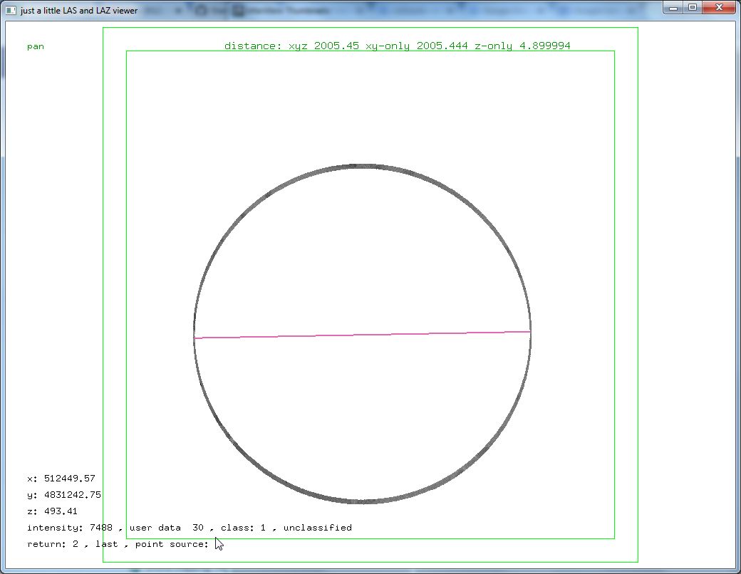 It always helps to give your LAZ files meaningful names in case you find them again two years later or so. We can nicely see the circular scanning pattern Leica’s SPL100 sensor. With lasview we measure that this single flightline has an extent of about 2000 meters on the ground. The lasinfo report shows a pulse density of around 19 last returns per square meter. We then sort the points by GPS time using lassort. This groups together all the returns that are the result of one „shot“ of the laser with 100 beamlets as we can nicely see in the las2txt output below. Each group of returns has slightly below 100 points and there is one group every 0.00002 seconds. This means the SPL100 is firing once every 20 microseconds.