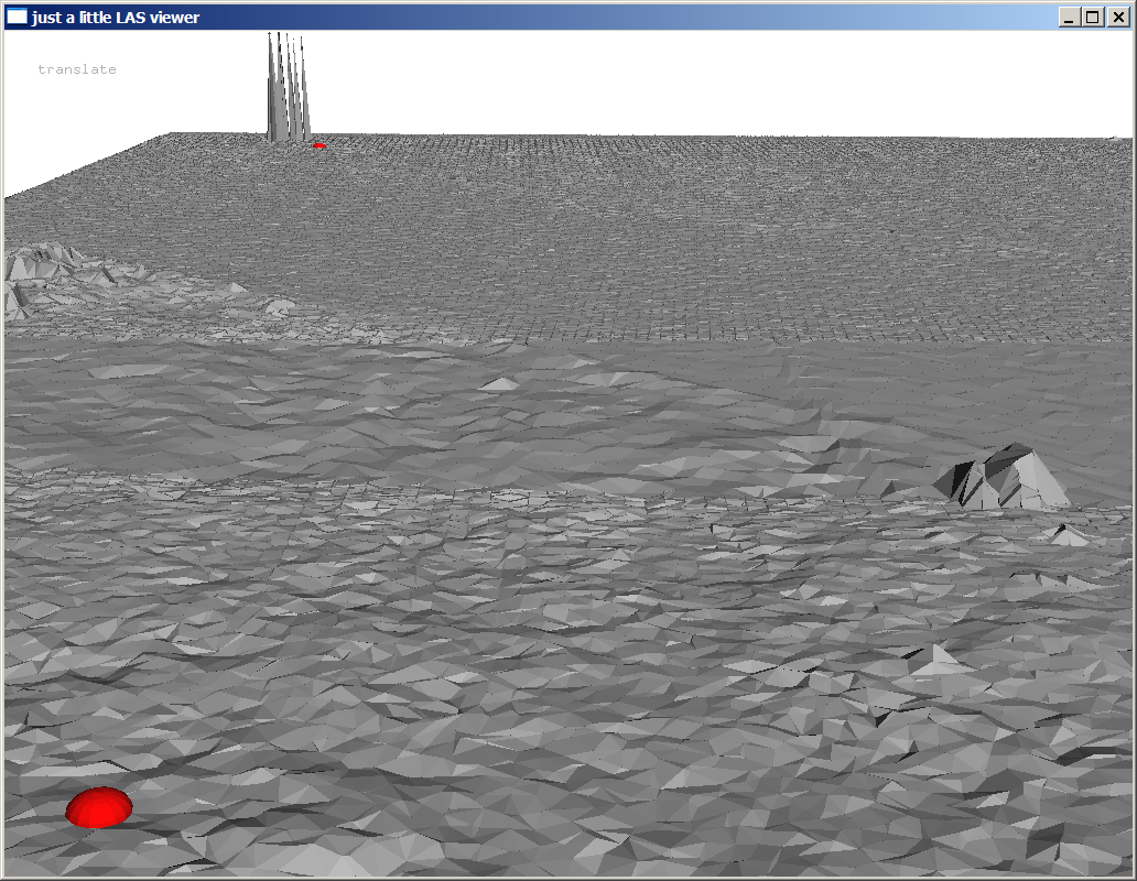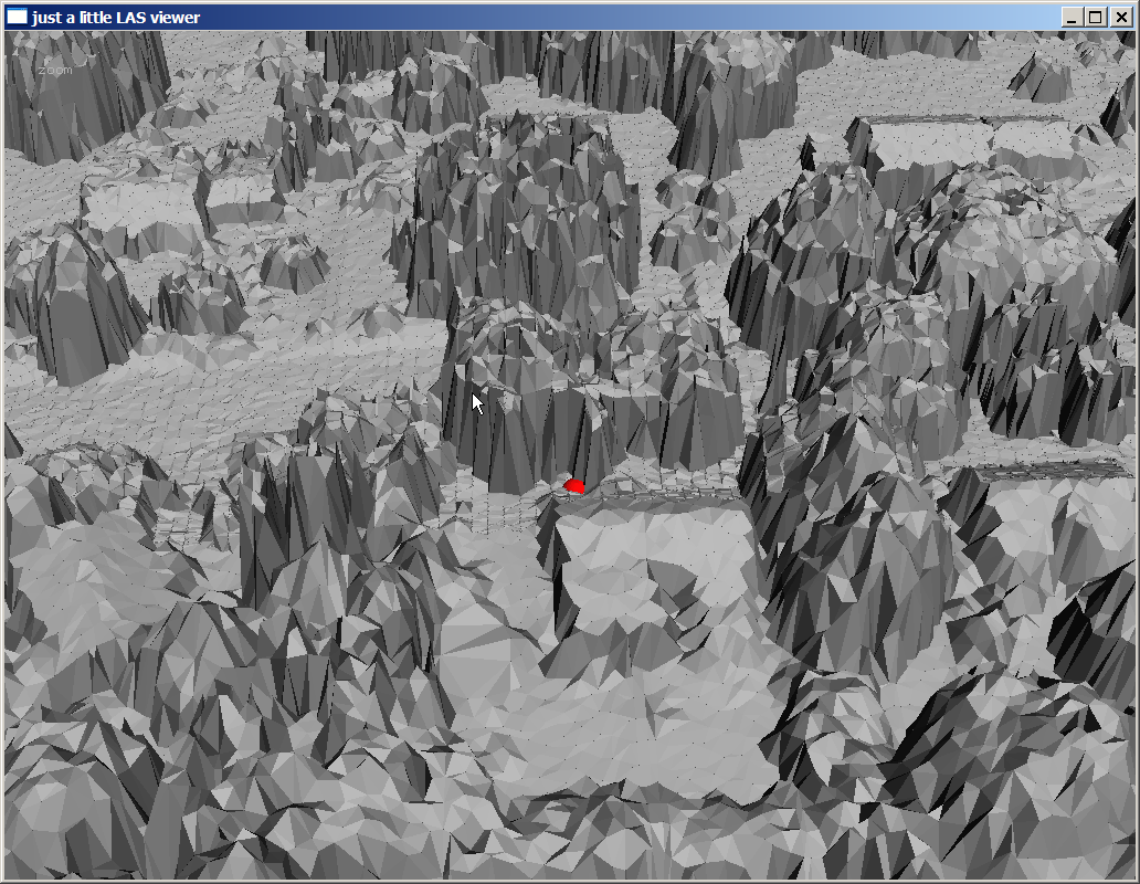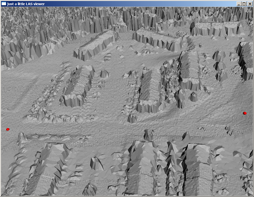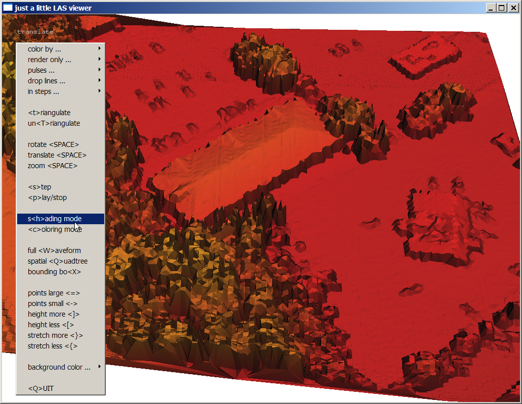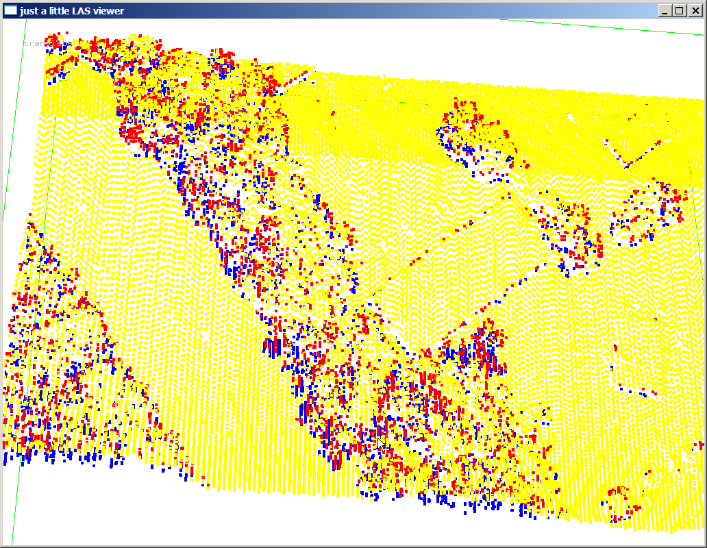 The coloring by flight-line which is supposed to be stored in the ‚point_source_ID‘ field of each point seems rather odd. This field was probably used for some other purpose and not cleaned up before the data was distributed. Not nice and we will fix that later. There are a few other visualization shown below. Coloring points by return turns single returns yellow, first of many returns red, and last of many returns blue. Usually there are also a few green points corresponding to intermediate (neither first nor last) of many returns but there are none in this data set as the ‚lasinfo‘ report will confirm later. Toggle through the colorings with the ‚c‘ key until it displays the intensities. You may need to press the ‚=‘ key a few times to increase the point size. Next, press the ‚t‘ key to triangulate the points and then decrease the point size with the ‚-‚ key until they have disappeared and you can see a hillside shading of the TIN. Use the ‚h‘ key to toggle through different shadings for the TIN triangles.